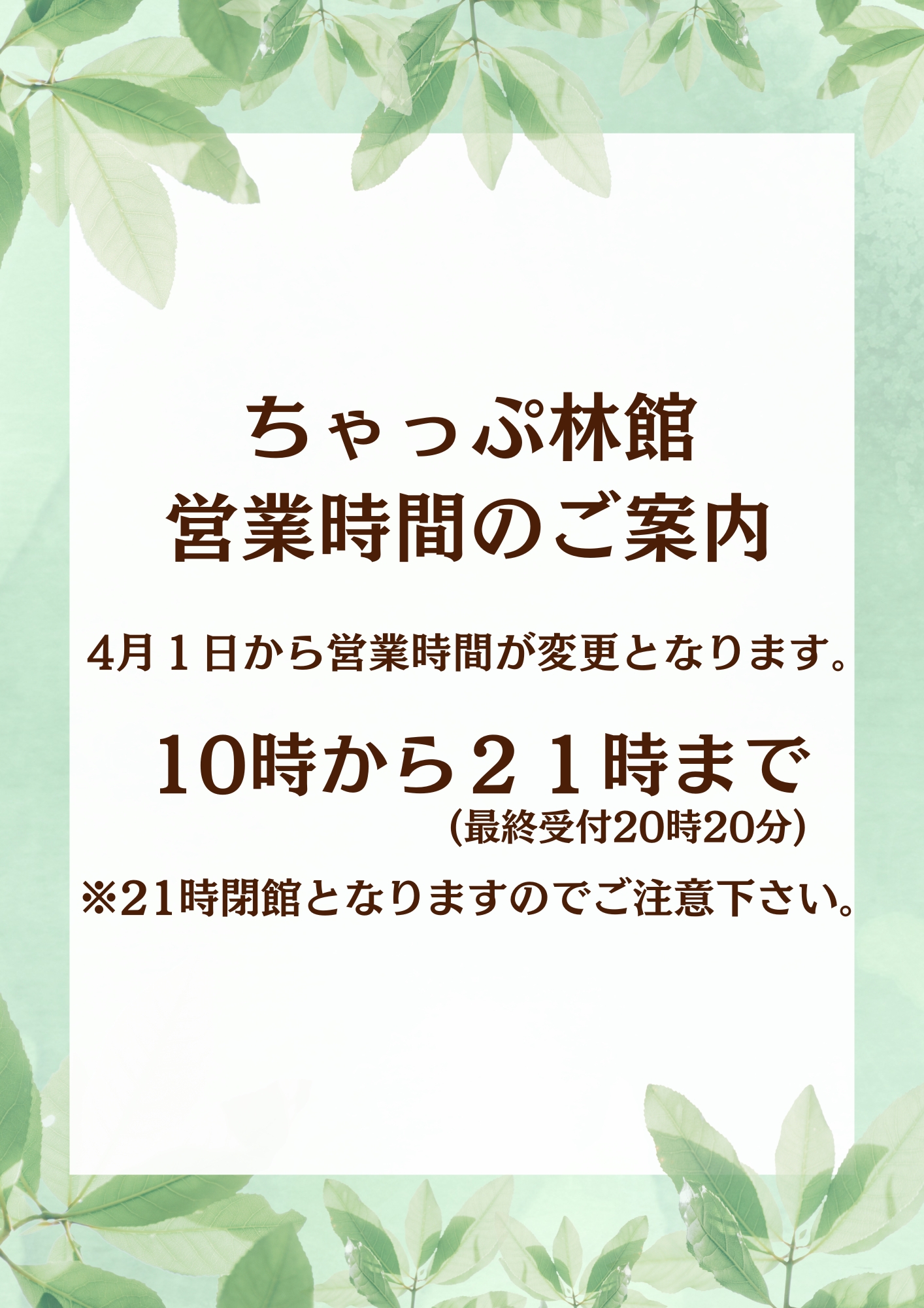 ちゃっぷ林館営業時間の変更について 2026/04/06 ちゃっぷ林館の営業時間変更についてのお知らせです。 誠に勝手ながら下記の通り、営業時間を変更させていただきます。 お客様にはご迷惑をお掛け致しますがご了承ください。 令和8年 4月 1日(水)~ 12月 31日 (木)まで 10:00 ~ 21:00(最終受付20:20) とさせていただきます。