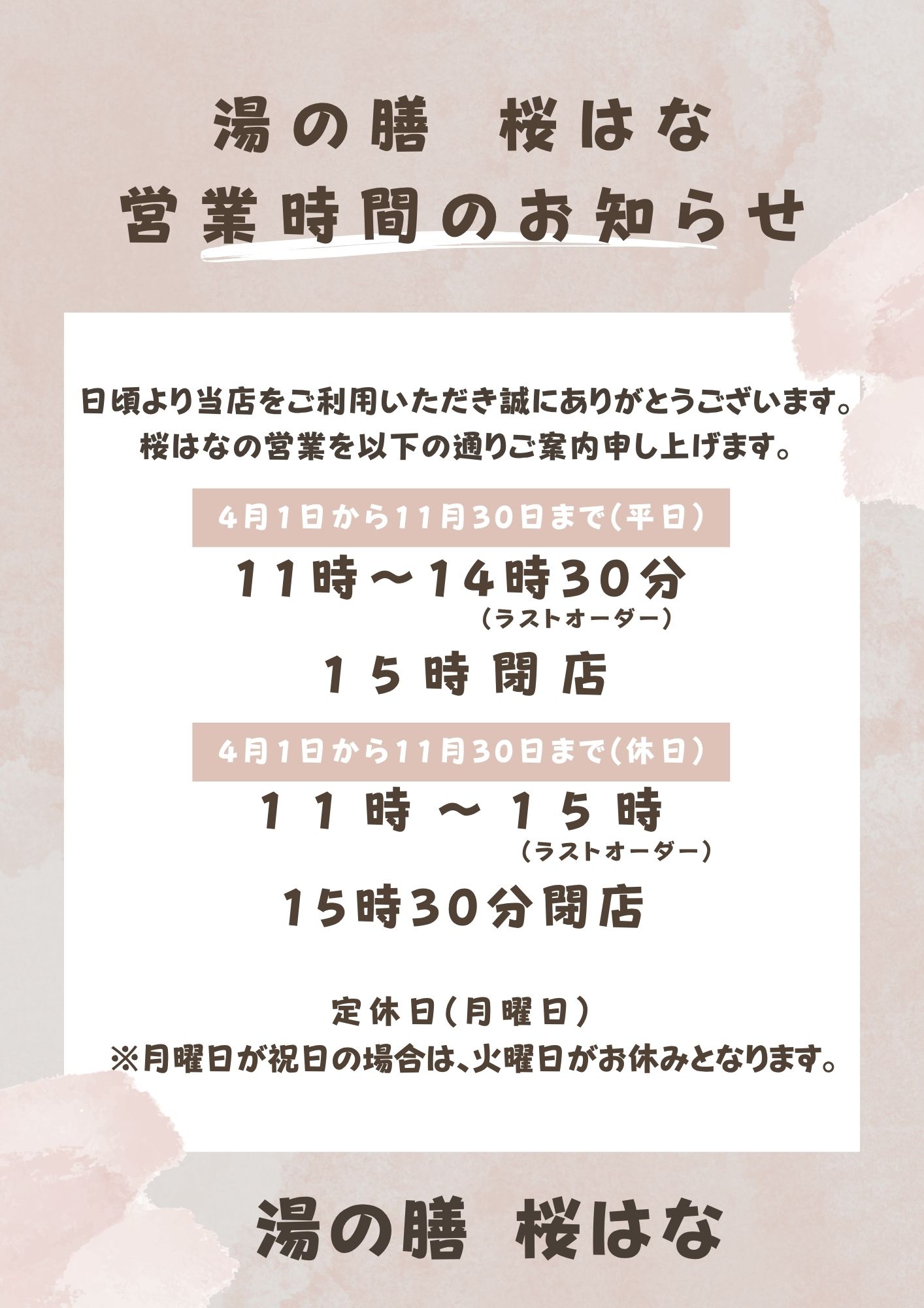 湯の膳 桜はなの営業時間についてのお知らせです。